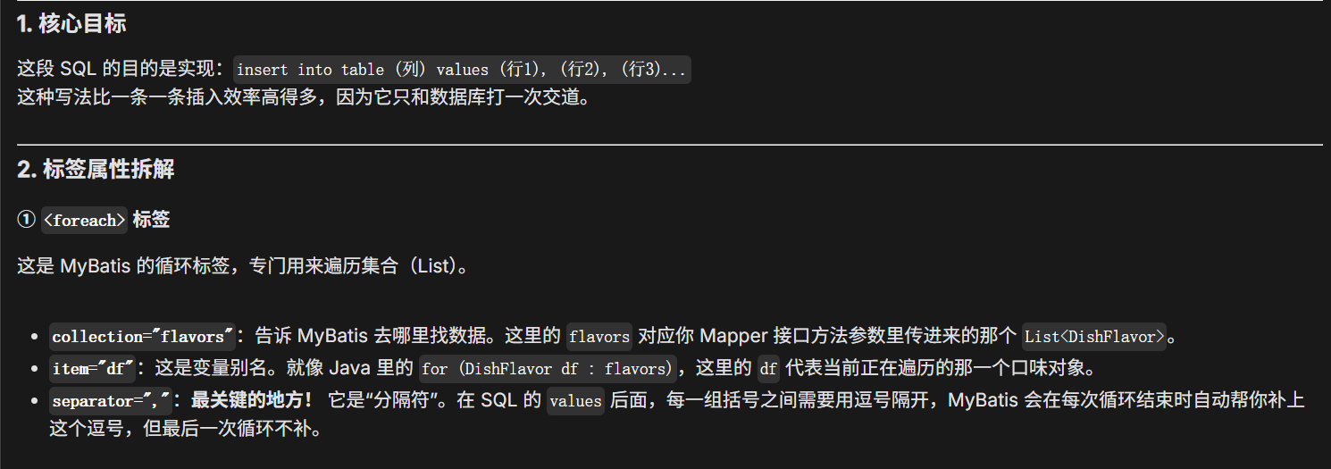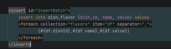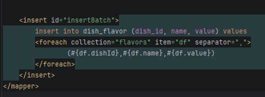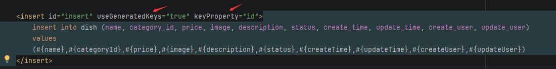 这里是insert操作,所以可以用上我们在前面做的AOP自动填充字段!这里的SQL比较特殊由于Flavor表需要记录dish_id但是这里我们的dish还未存进表里,自己也不清楚id是多少,所以利用动态SQL的操作且SQL中id(auto_increment)功能在插入之后自动将id写入entity中!代码如下所示: