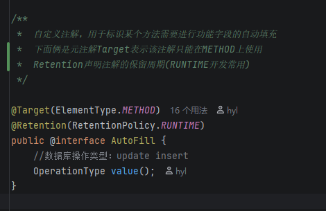 在AutoFill这个注解中定义了一个value属性,到时候可以指定这个注解修饰的方法是Insert还是Update!从而去动态调整需要填充的字段.............