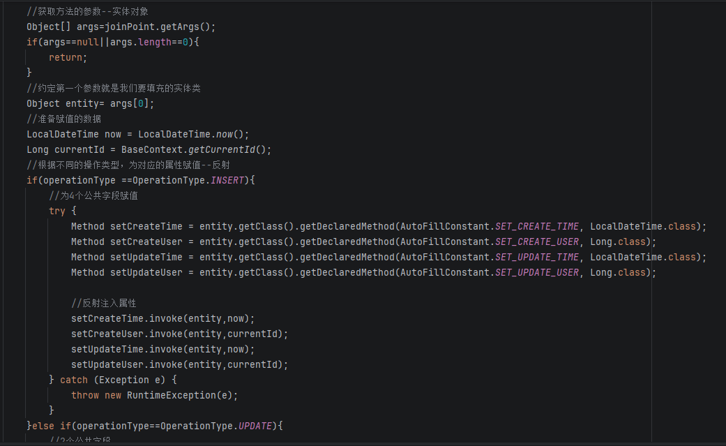 切入点定义完后就是编写业务的实现逻辑了,还记得业务逻辑吗(我们要在Insert和Update之前给字段自动填充)