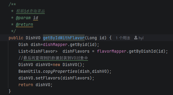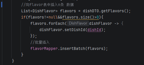 这里的dishId最初都不知道,在dish插入表中由SQL自增得到,所以我们需要给前端传来的List<Flavor> flavors用for循环调用set方法给Flavor中的dishId进行赋值.....代码如下所示: