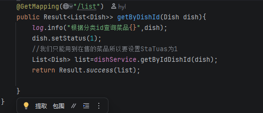 这里一个分类可能拥有多个菜品,所以查出来的应该是一个List<Dish>,简单说一下前端就通过Query传递了一个categoryId 后端需要返回一个List<Dish>
