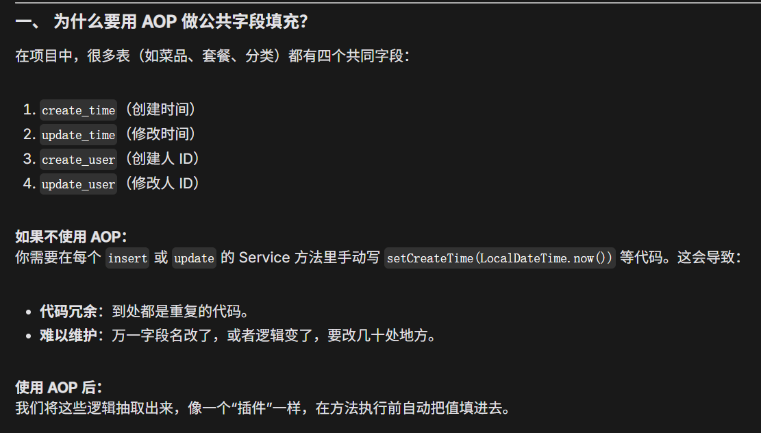 在前面两天就有提及比如新增员工、新增分类这些功能,我们都需要添加createUser、createTime、updateUser、updateTime这些字段的数据,但是如果每次都要自己加一段代码未免太过麻烦,并且如果以后需要修改一段一段改到猴年马月?