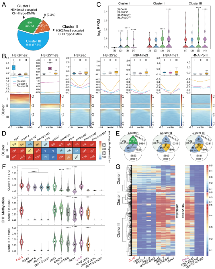 基于不同簇的染色质特征,研究者将各簇的CHH hypo-DMRs与已发表的多种DNA甲基化通路缺失突变体(如nrpe1/nrpd1代表RdDM缺陷,cmt2代表CMT2缺陷,suvh4/5/6代表H3K9甲基转移酶缺陷,ddm1代表染色质量塑因子缺陷)的WGBS数据进行重叠分析(图2D-E)。分析结果表明,Cluster I (H3K9me2富集)的DMRs与suvh4/5/6、cmt2和ddm1突变体定义的区域广泛重叠,与RdDM (nrpe1) 区域也有中度重叠,表明在H3K9me2富集区,该模块同时与SUVH4/5-CMT2环路和RdDM通路重叠。Cluster II和III(H3K27me3或无标记)则主要与RdDM缺陷突变体(nrpe1, nrpd1)的DMRs重叠,与cmt2重叠极少。