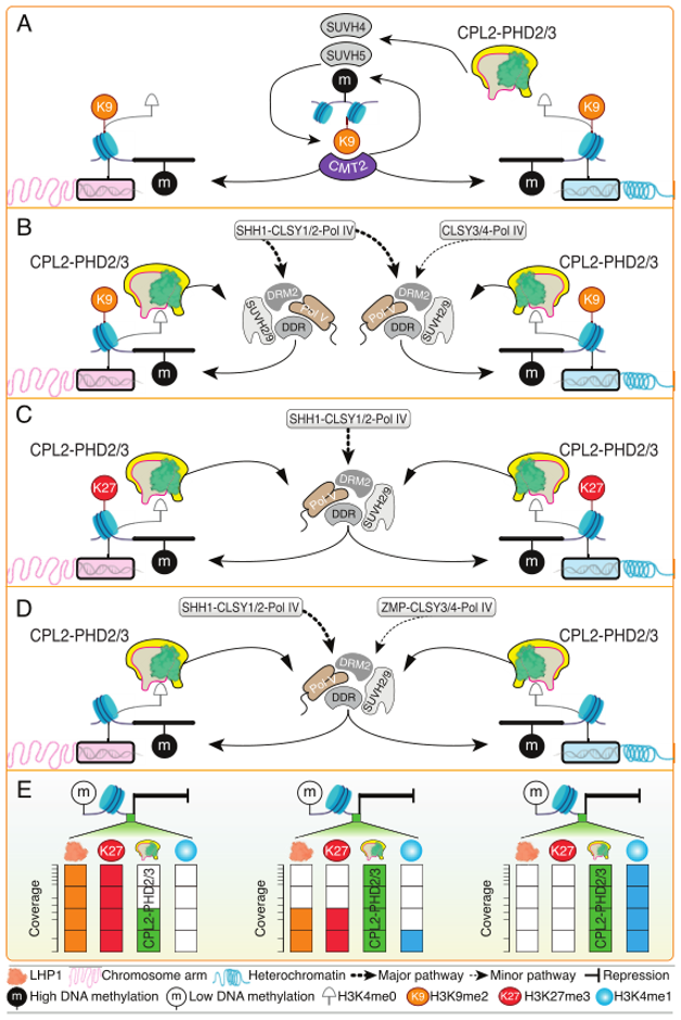 - 在大部分H3K9me2和H3K27me3缺失位点,CPL2--PHD2/3支持RdDM,其活性主要由SHH1--CLSY1/2--Pol IV引导,ZMP--CLSY3/4--Pol IV在全基因组范围内发挥次要作用。