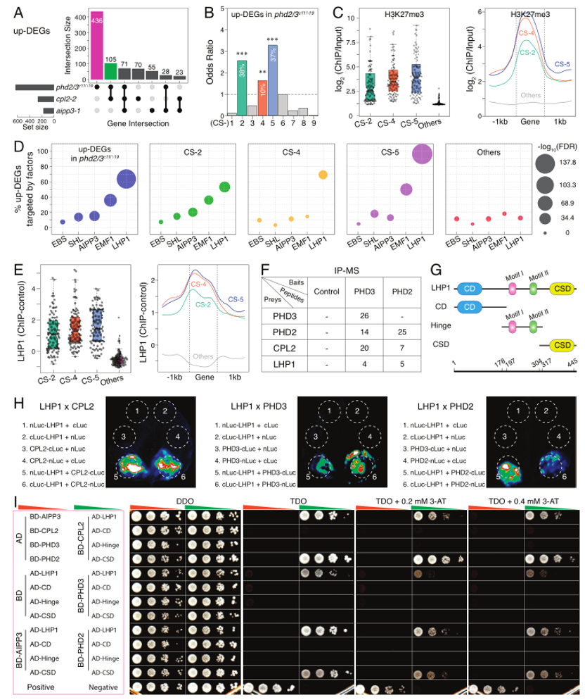 CPL2-PHD2/3在基因沉默中的功能与Polycomb通路相关。RNA-seq分析发现,phd2/3C 突变体中上调的差异表达基因(up-DEGs)绝大多数(>60%)与LHP1的ChIP-seq结合位点重叠,且这些基因显著富集在H3K27me3标记的染色质状态(CS-2, CS-4, CS-5)中(图4B、C、D)。