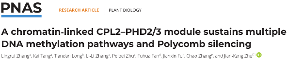 Zhang L, ...et al, Zhu JK. A chromatin-linked CPL2-PHD2/3 module sustains multiple DNA methylation pathways and Polycomb silencing. Proc Natl Acad Sci U S A. 2025 Nov 25;122(47):e2523102122. doi: 10.1073/pnas.2523102122.