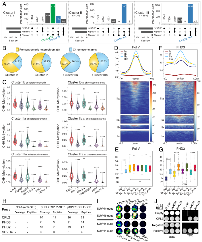 作者为了进一步解析CPL2-PHD2/3如何支持RdDM,研究者将DMRs细分为更具体的调控类别(CMT2特异、RdDM特异等)。分析结果表明,Clusters IIa和IIIa(占Clusters II/III的75-80%)仅与nrpd1-4 DMRs重叠,而不与cmt2-7重叠(图3A),表明这些区域完全由RdDM调控。基因组定位显示,Cluster Ia和Ib偏好性定位于近着丝粒异染色质,而Clusters IIa和IIIa富集于染色体臂上(图3B)。甲基化分析揭示,clsy1/2双突变体和shh1单突变体在所有簇中均导致CHH甲基化显著降低,而clsy3/4影响有限(图3C),表明CPL2--PHD2/3主要依赖SHH1--CLSY1/2--Pol IV分支招募Pol IV。