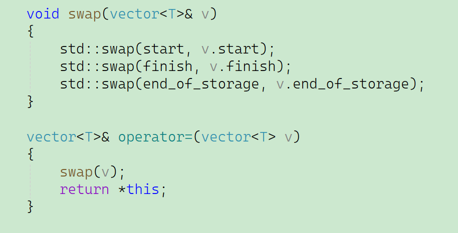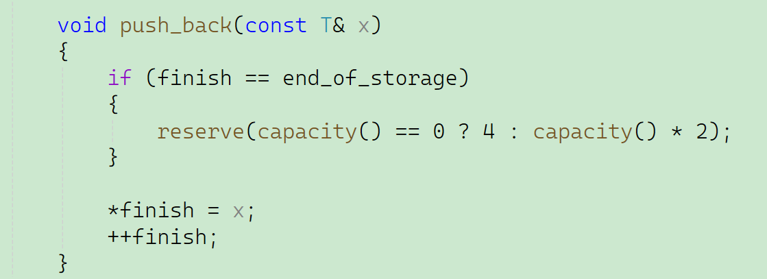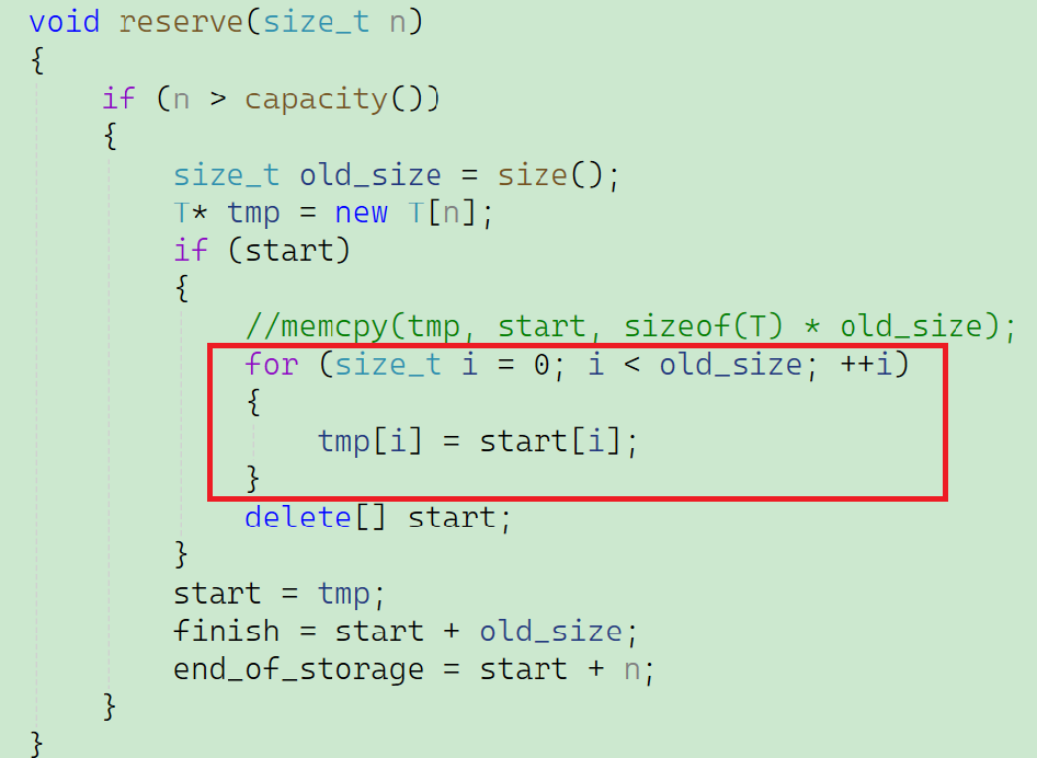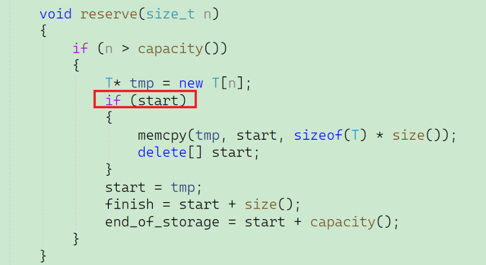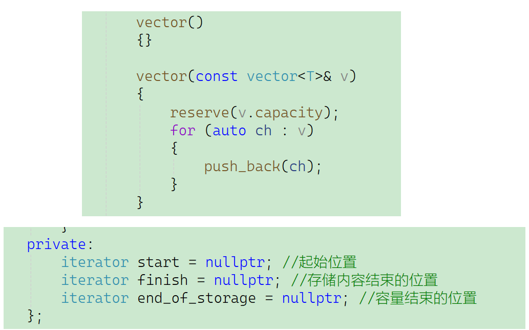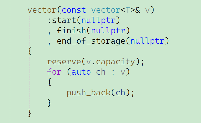 既然是拷贝构造函数,那一定要是深拷贝,这里拷贝构造函数先初始化 ,是为了避免这些指针在调用 reserve/push_back 前处于未初始化的随机地址状态,防止后续内存操作(如 reserve 里的 if (start) 判断)出错,保证内存操作的安全性。