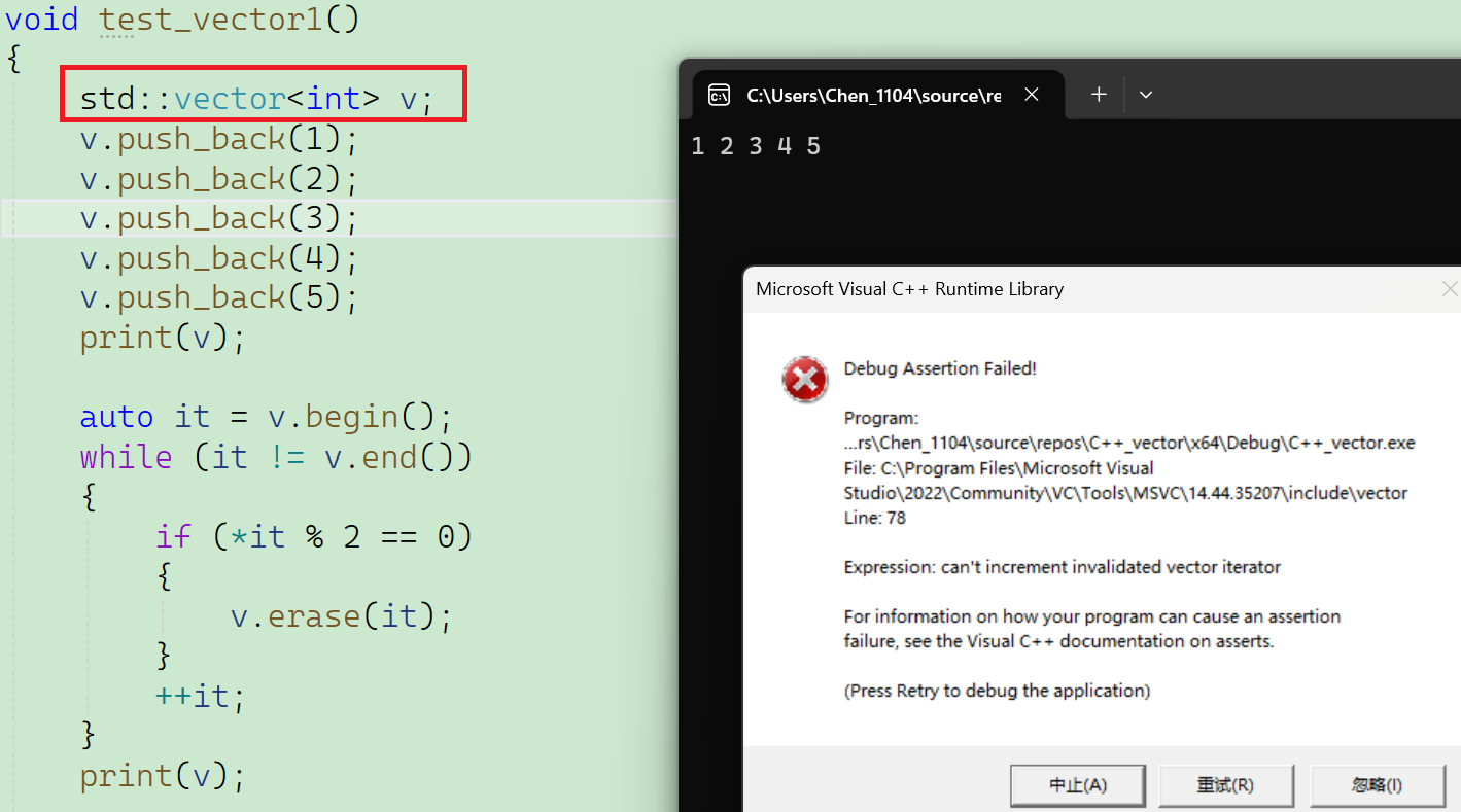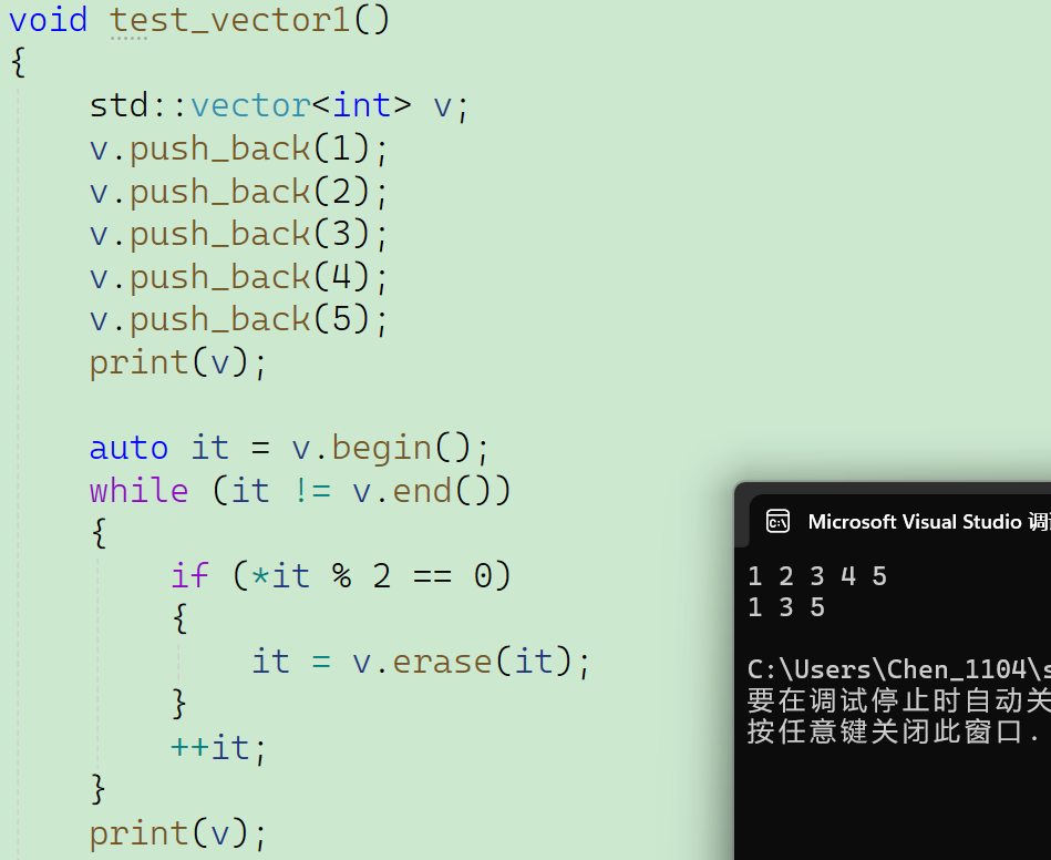 对于我们刚刚插入的12345,这五个数据,我现在想要把其中的偶数都删除掉,这个时候就需要用到erase。我们先来测试一下标准命名空间里面的vector容器的erase: