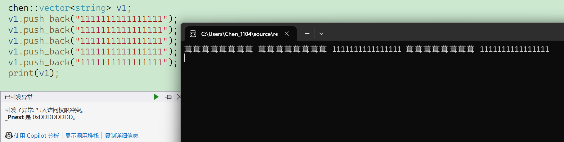 对于这样一段代码我先实例化了一个string类型的vector对象,然后往里面插入了五个字符串,再将其打印。结果打印出来的是一堆代码,我们之前说到出现乱码的情况大多是出现野指针等问题,并且这里还引发了一个异常叫做:写入访问权限冲突。
