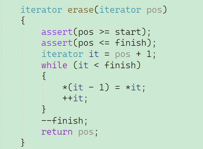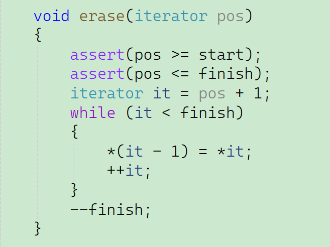 同样的,既然是插入,首先,肯定要检查一下是否需要扩容。并且因为是在指定位置插入,所以还需要判断一下选择的位置是不是一个合法位置。然后我们让第pos个位置往后的内容,都依次向后移动,再让第pos个位置等于我们要插入的内容,最后再把finish的位置向后移动一个。