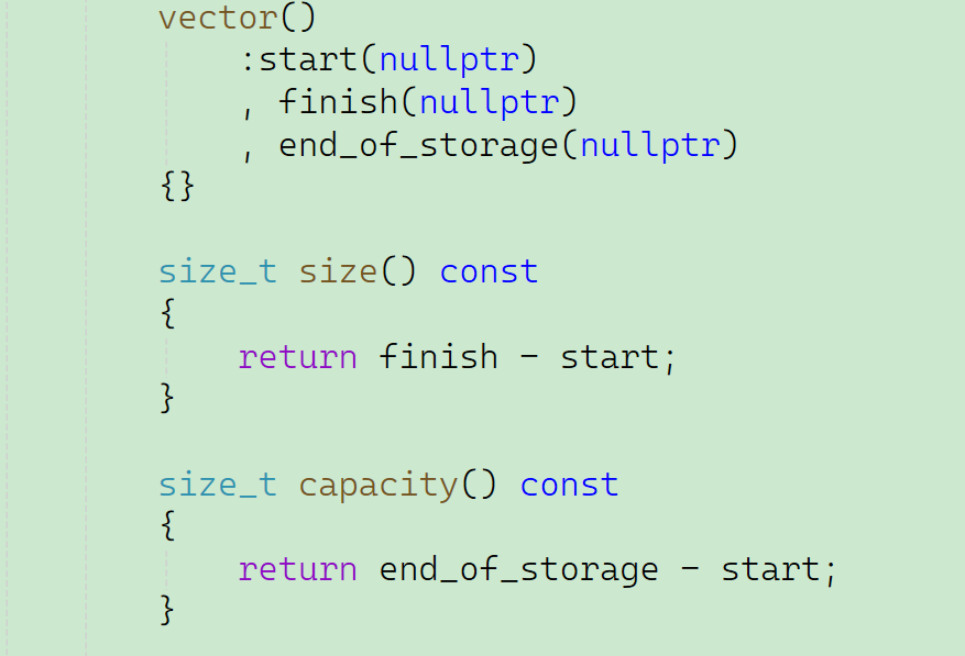 因为对于我们模拟实现的这个vector来说,三个成员变量实际上都是指针,那初始化的话,只需要通过初始化列表,将成员函数都置为nullptr即可。同时我们还需要知道我们所定义的vector的大小和容量,所以需要显示定义函数。只需要返回两个位置的差值即可。
