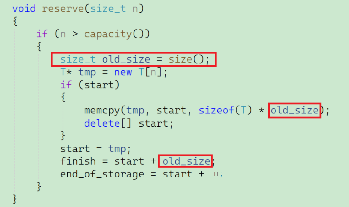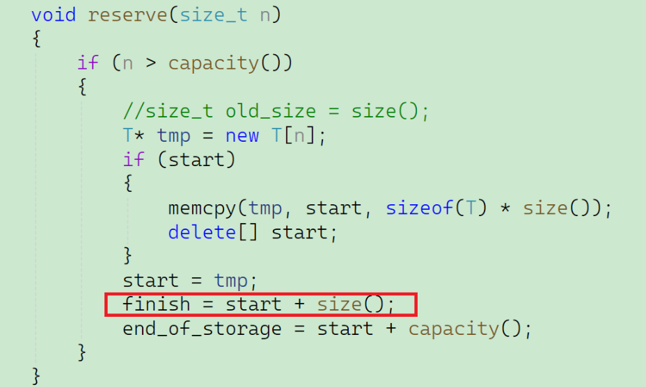 在扩容阶段开辟的这段空间是没有存储内容的,那么finish和start应该指向的是同一个地方,就如图中所示,而不是原来被初始化成的nullptr。但是我们来看一下对于finish = start + size();这行代码,按照我们的逻辑,应该是 finish = start + 0 ; 才能使得finish和start是指向同一位置。但是,对于size()函数的返回值中的finish - start,此时finish还是nullptr,start已经是tmp指向的位置,所以返回值就不可能是0。而只有当finish和start都是nullptr的时候,size()函数的返回值才是0。也就意味着,我们需要的是start在被赋值成tmp之前的size()的返回值。