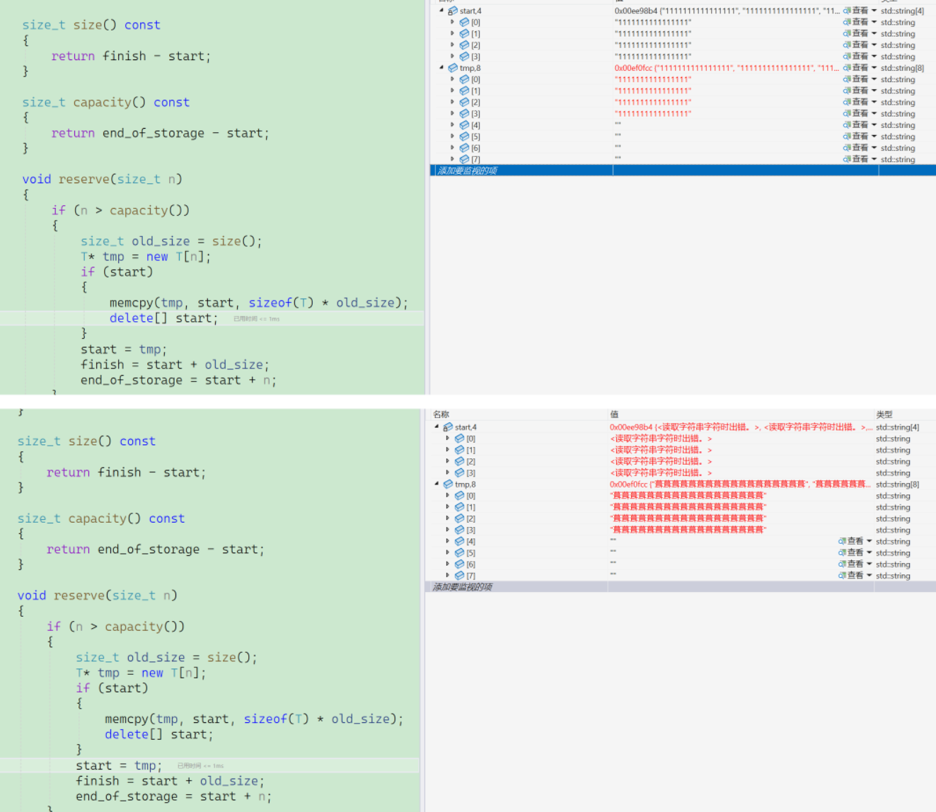 我们通过调试,经过监视窗口能发现在reserve函数当中,扩容的时候需要释放掉旧空间,也就是在释放掉旧空间的时候,即delete[ ] start这一行代码上发生了问题。可是我们释放的明明是原来的旧空间start啊,为什么这里的新开辟的tmp空间会受到影响呢?这其实就是深层次的深拷贝问题。原因就在string身上。