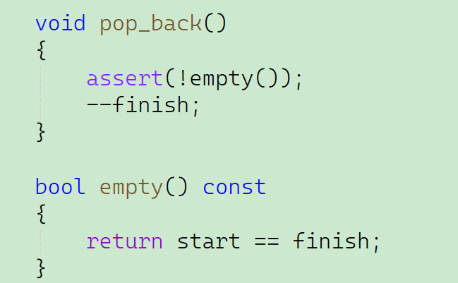 和模拟实现string时的尾删除函数一样,我们只需要使存储内容的最后一位指针向前移动一位即可,对于尾部的指针存储的内容不需要去给置为0。此外,这里还需要进行一次断言,因为如果存储的最后一个内容的指针都要比最开始的指针靠前的话,就会引发报错。