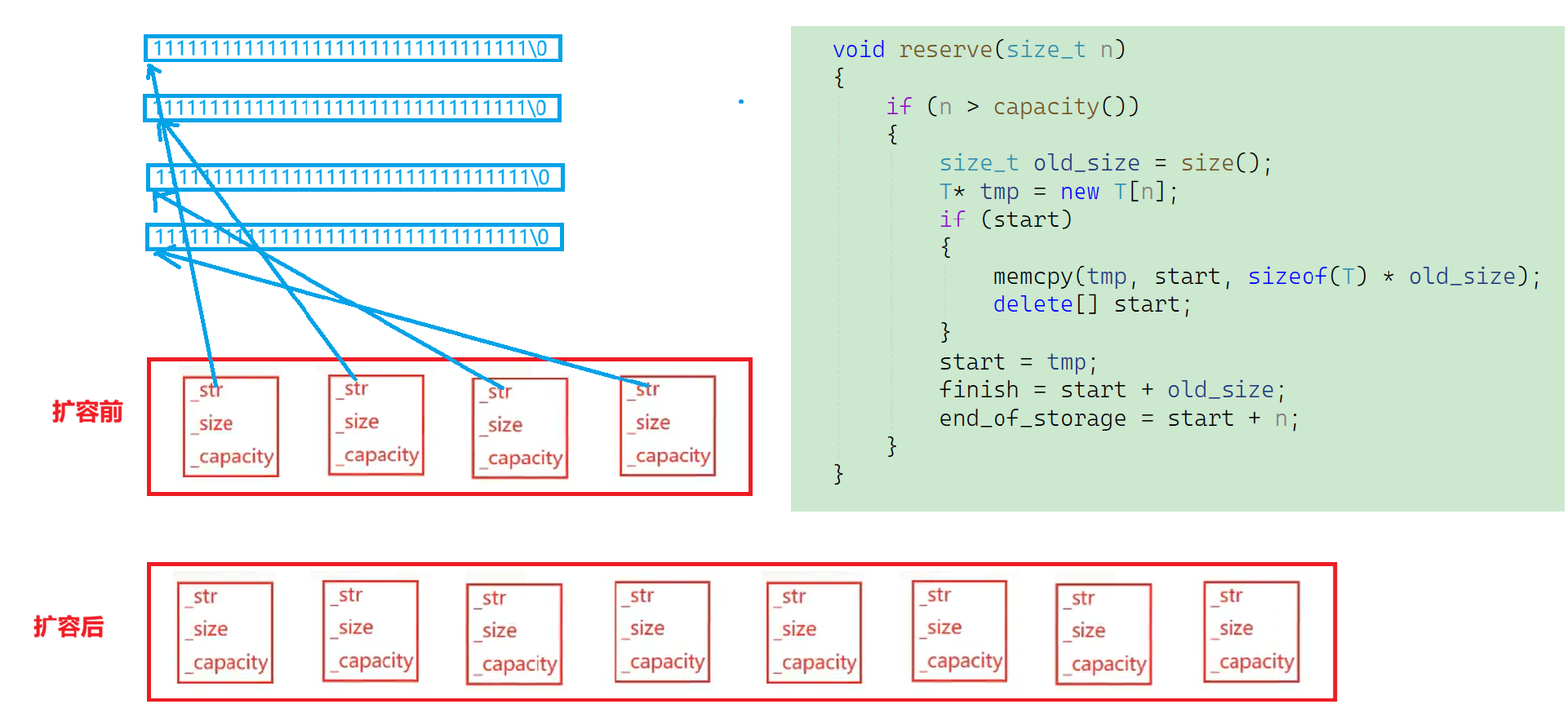 在扩容之前vector这个数组里面已经存储了4个string类对象,在扩容之后,容量大小就扩充到了8个。并且扩容之前,string类对象里面的_str都指向堆上存放的字符串,我们在之前的string容器讲解中提到过:当字符串比较少的时候会存放在栈的缓冲区,当字符串长度大于一定限制使就会存放到堆内存空间当中。