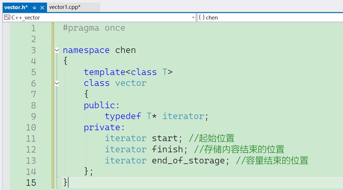 因为标准命名空间里的vector类是一个模板,所以我们也在头文件里面声明定义一个模板。这边需要注意的是,对于模板来说,声明和定义必须放在一个文件下,不然会引发链接错误。并且为了和标准命名空间里面的vector区分开来,我们需要自己定义一个命名空间,然后把我们的模拟实现的类模板放进去。