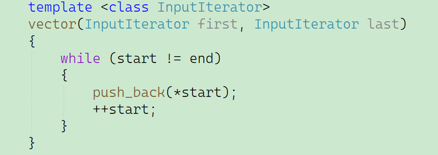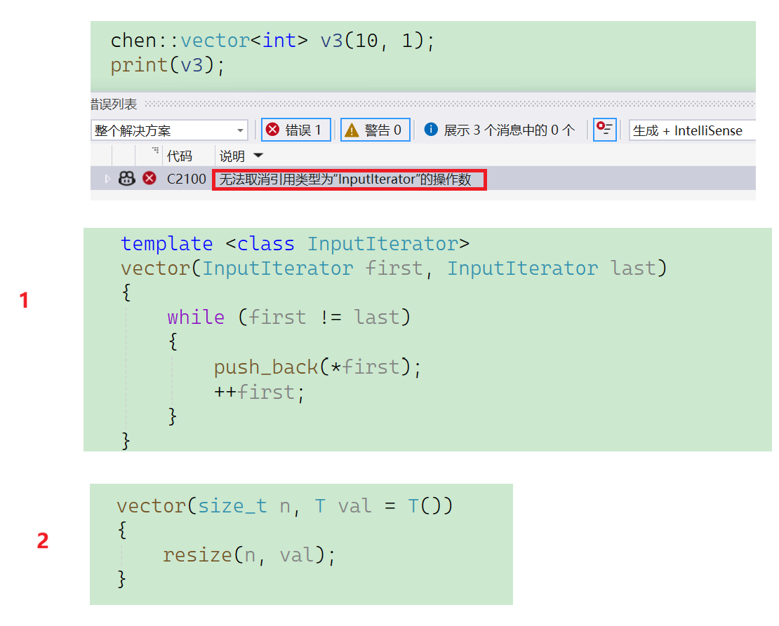 我们会发现这段代码发生了一个报错内容是:无法取消引用类型为inputiterator的操作数。实际上这里的意思是:对于这段代码,它调用的是我们刚刚写的这个模板,而不是第二个。但我们本来的想法就是想让编译器调用第二个函数,帮我们实现构造,这里为什么会调用到模板呢?