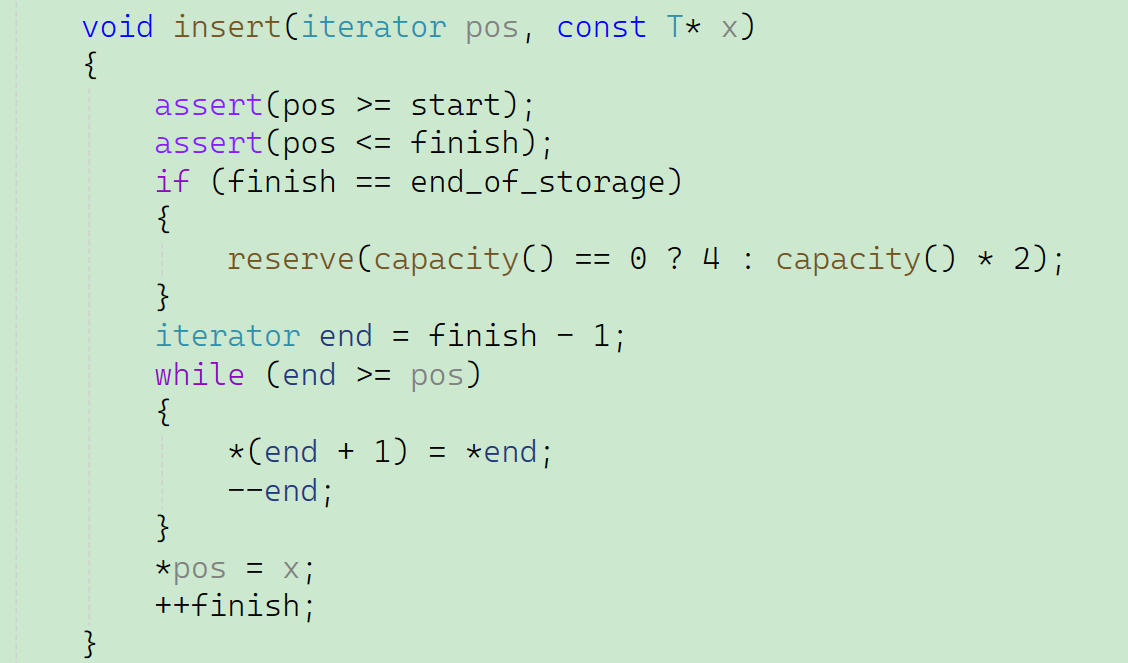 因为既然要插入内容,那就有可能会遇到扩容的问题。首先我们要先检查一下传值过来的n是不是大于我当前的容量,如果大于的话我才要开辟空间。因为start这个成员变量在初始化的时候是空指针,所以还需要检查一下原来的内容有没有开辟空间大小。如果原来的内容有空间大小的话,还需要把原来空间里的内容都拷贝到新开辟的空间,再把原空间给释放掉。然后再把存储内容结束的位置和容量结束的位置进行一下修改。