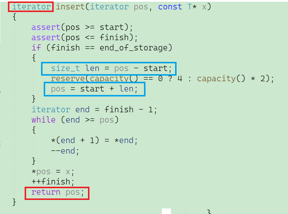 我们在扩容操作之前先记录一下pos到start位置的距离,在扩容结束之后,再让start加上这段距离,就表示扩容之后的新的pos位置。这样就解决了迭代器失效的问题。