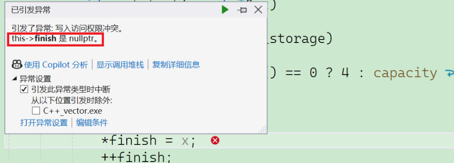 这里会引发一个异常:finish是nullptr。到这里大家可能会很疑惑:finish怎么会是nullptr呢?我们在扩容阶段不是把它修改过了吗: