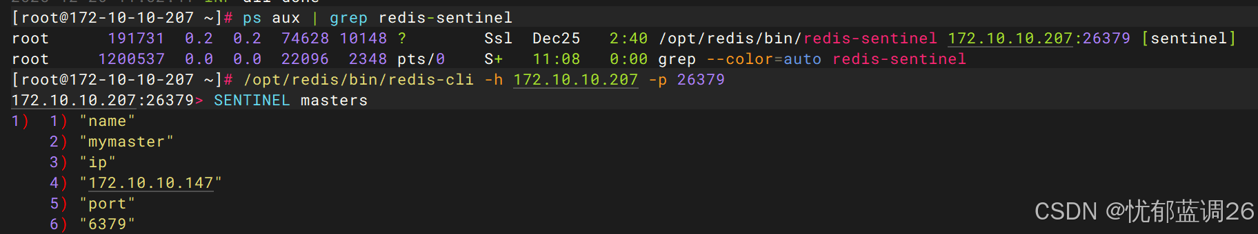 记录master_name和Sentinel地址(如172.10.10.207:26379)。