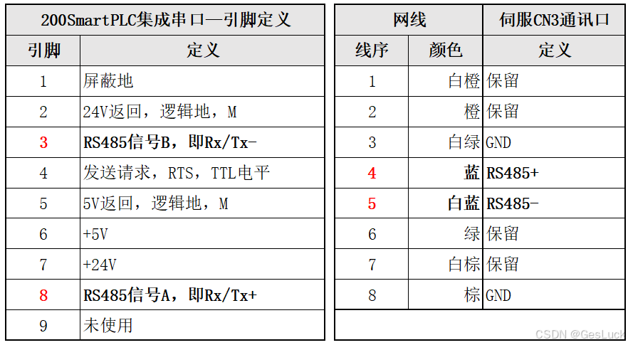 - PLC引脚3 ( B -) → 伺服CN3-5(RS485-)------------ [蓝线]
