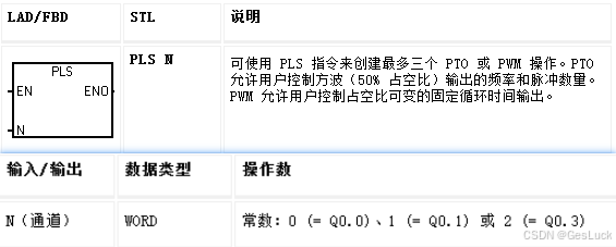 PLS) :指令控制高速输出(Q0.0、Q0.1 和 Q0.3)是否提供脉冲串输出 (PTO) 和脉宽调制 (PWM) 功能(若使用 PWM,可通过可选向导来创建 PWM 指令)