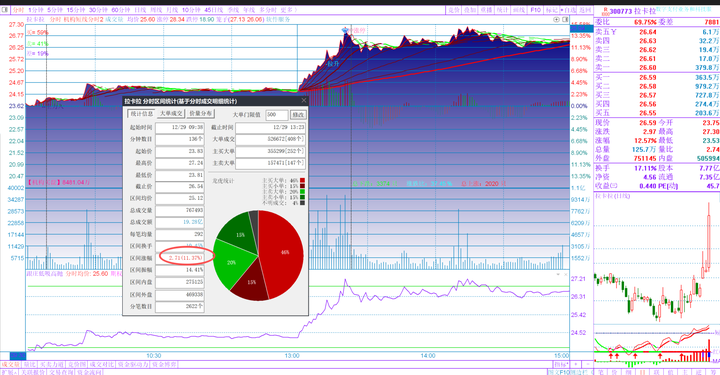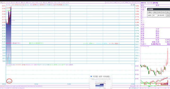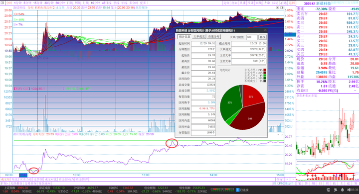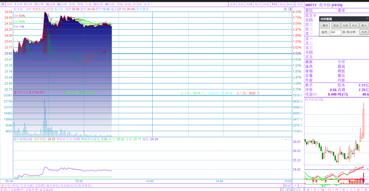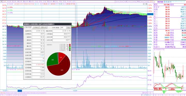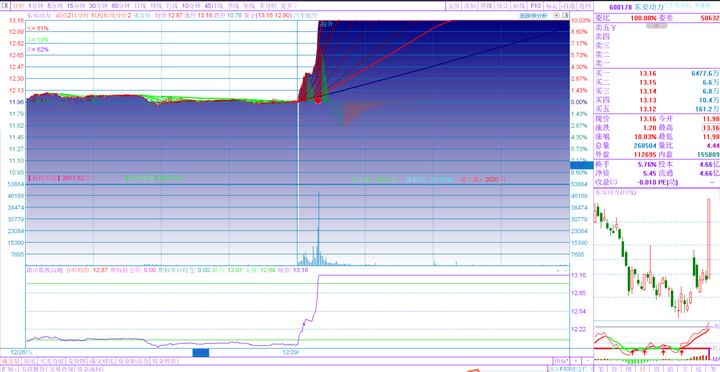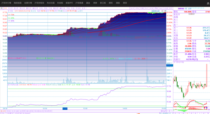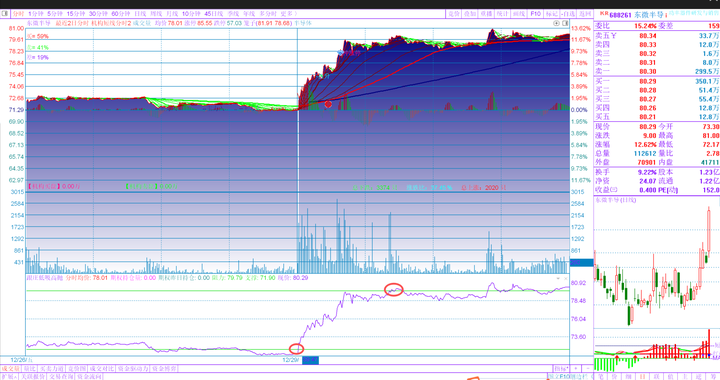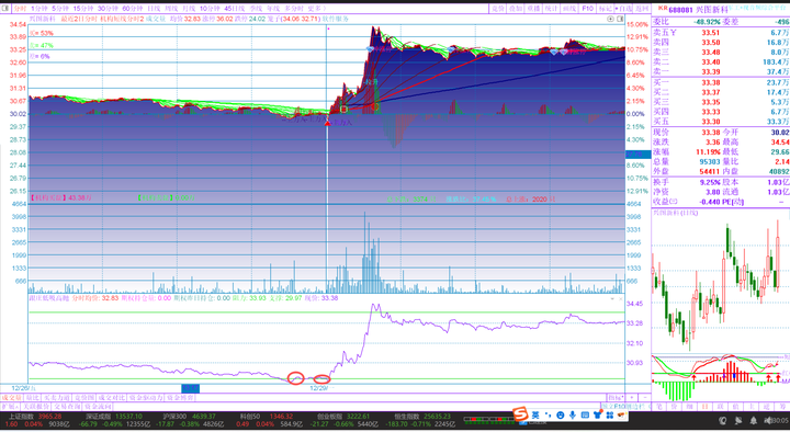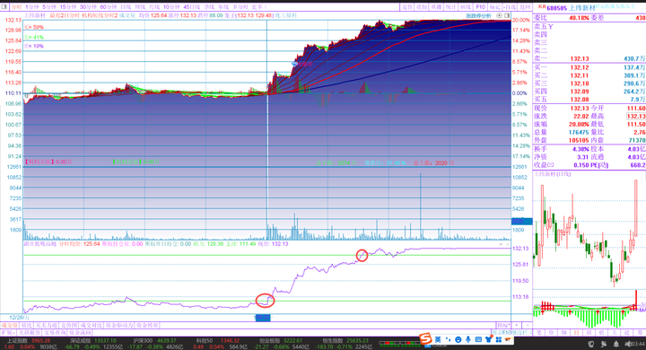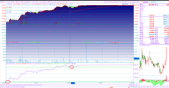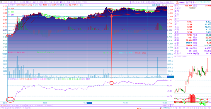 来看下当时盘中的信号,如上图,分时开始拉升,副图指标出现上穿底部绿色线时这个时候可以进场。
