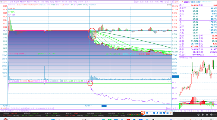 如上图,这种高位转跌,分时副图指标跌破顶部绿色线的,及时减仓或卖出。