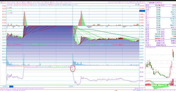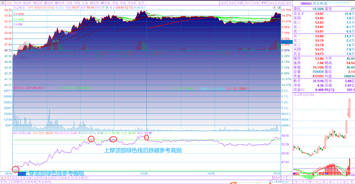 如上图,切换到持续2日的分时走势图,我们就可以看到今日开盘突破前一日的底部绿色线。如果我们今日分时看到突破,可以尝试性低吸进入。后面就没没机会往下了,行情一路上行,突破上面的绿色线。如果有持股的,在跌破绿色线时减仓,当然盘中再度拉回去上面绿色线之上,维持强势可以继续持股,后面如果跌破可以减仓。