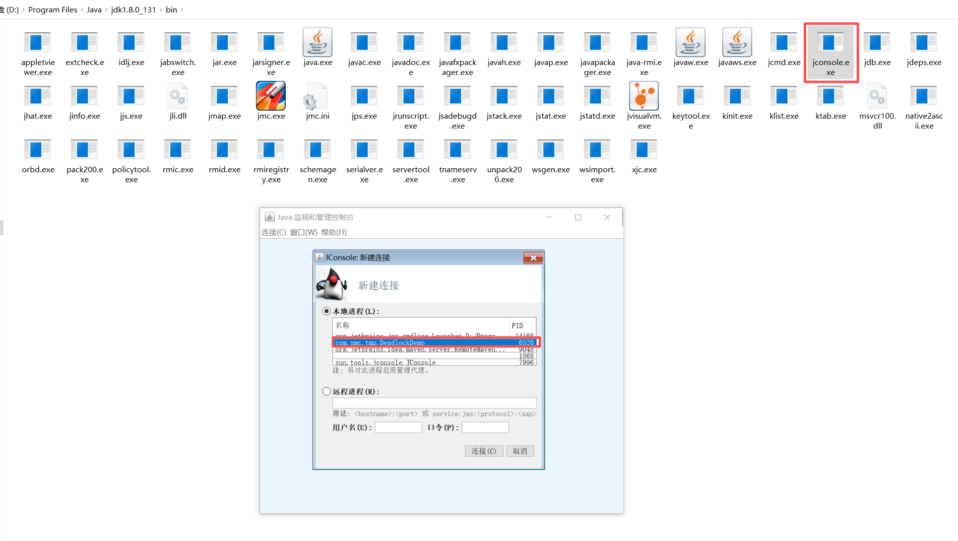 - 第二步我们要找到 JDK 的 bin 目录,找到 jconsole 并双击打开,并选择我死锁demo的进程