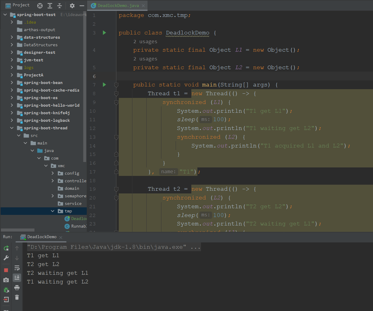 - 第一步运行我们编写的死锁示例