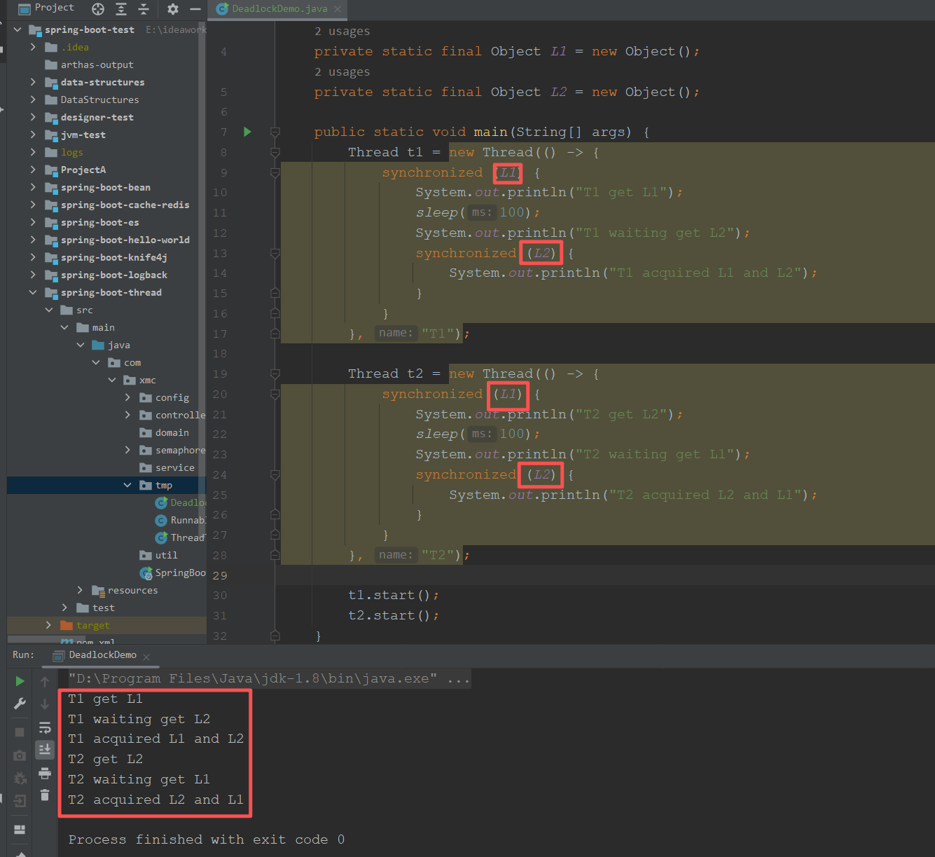 System.out.println("T2 acquired L2 and L1");