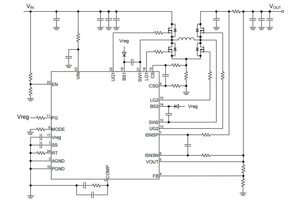 14.将 Vreg 旁路电容放置在控制器 IC 附近,并连接在 Vreg 和 PGND 引脚之间。通常使用 2.2μF 的陶瓷电容。