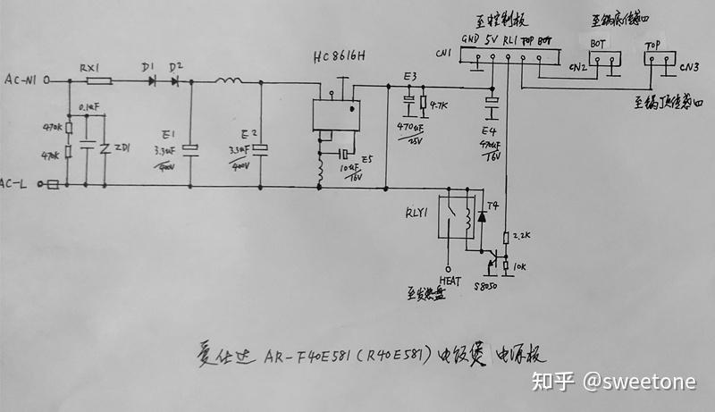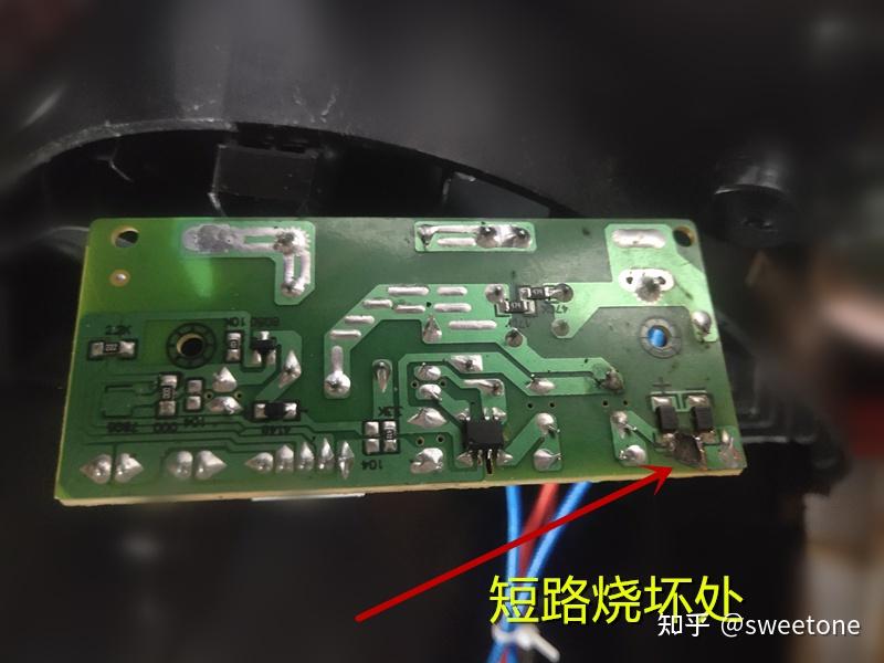 一台爱仕达AR-F40E581电饭煲接通电源,显示屏不亮,按键失效。检查电饭煲保险丝正常。拆下电源板,可以看到电源板高压侧整流二极管D1,D2两侧的主板上有烧焦痕迹,测出限流电阻RX1烧毁,其他元件基本正常。而主板底下有好几只炸飞的蟑螂。可见,是为了取暖的蟑螂短路了二极管D1,D2,造成220V交流电经过E1,E2交流短路,于是,大电流烧毁电阻RX1。