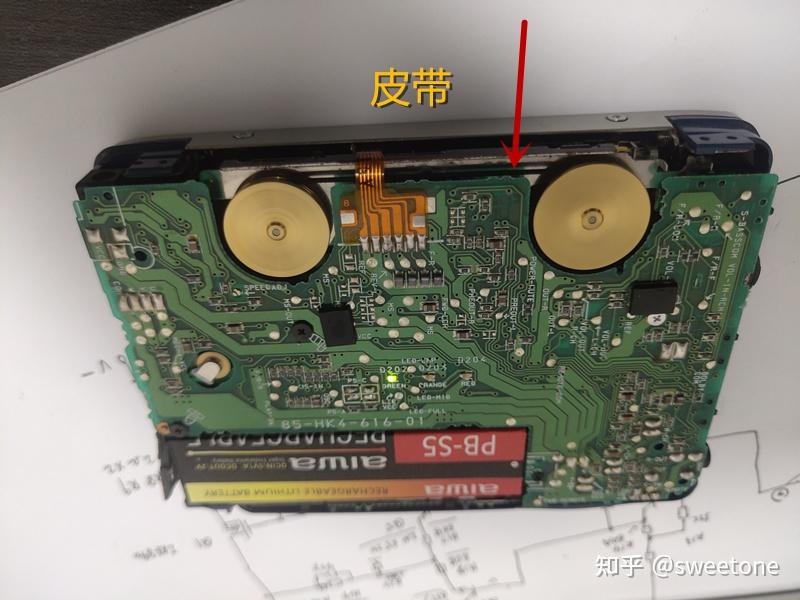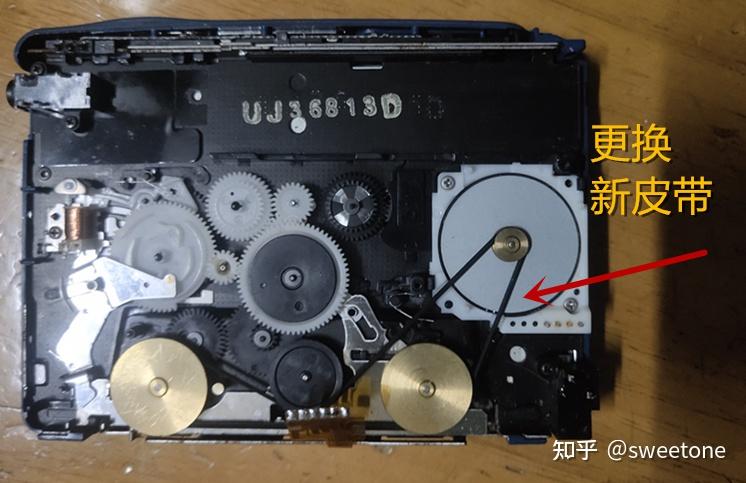 用手按该机器的播放,快进,快退轻触键,机芯有卡卡动作声,但是磁带不转。机主认为是皮带老化,让笔者帮助换皮带。