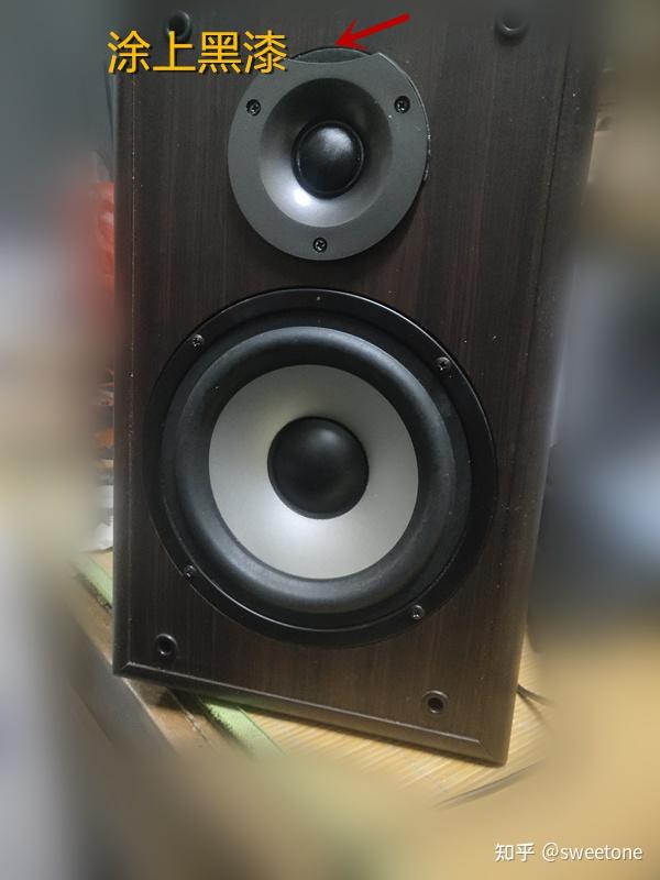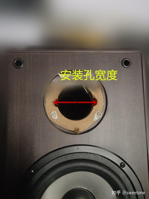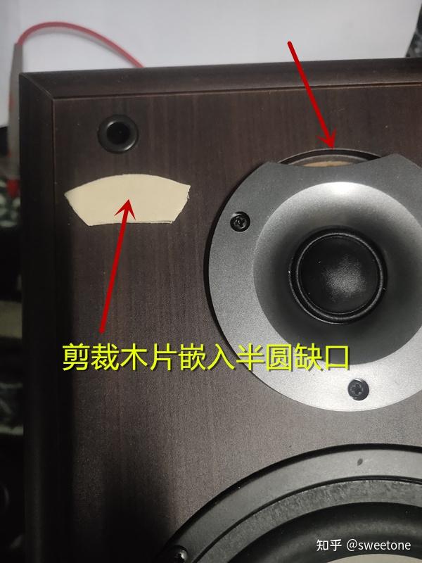 - 此高音喇叭面板上有一个半圆缺口,原设计是为了高音喇叭与低音喇叭的中轴线更接近,使得两个喇叭的发声更接近于同轴共点发声。此喇叭在本箱体上安装的话,由于半圆缺口的存在,影响美观。测量高音喇叭面板的厚度,用一块厚度接近的木片加工成半圆形状粘在半圆缺口处,再在木片上涂上黑漆,就不影响美观了。
