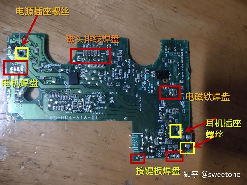 2.拆主板需要焊开的焊点:1.磁头排线焊盘;2. 电机端子焊盘;3.电磁铁端子焊盘;4轻触板焊盘