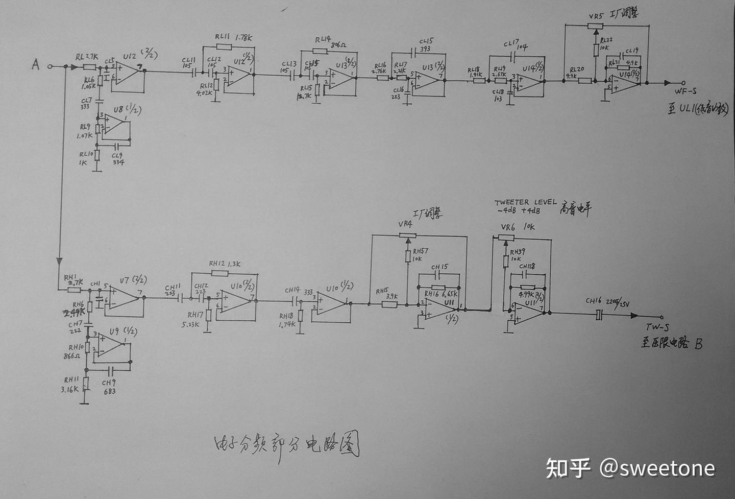 高音通道:信号先经过U9(1/2)与外围元件组成的模拟电感电路,使得信号在此设定的频点谐振,以此对高音信号频响曲线做一定调整。信号再经过U7(2/2)缓冲后,输入U10(2/2)与外围元件组成的2阶高通滤波电路**、**U10(1/2)与外围元件组成的1阶高通滤波电路滤除2500hz以下的低频信号后,在U11(1/2)和工厂调整音量电位器VR4组成的反馈式音量放大电路调整音量和在U11(2/2)和后面板高音电平电位器VR6组成的反馈式音量放大电路调整音量后,输入高音压限电路。(电路如图10所示)