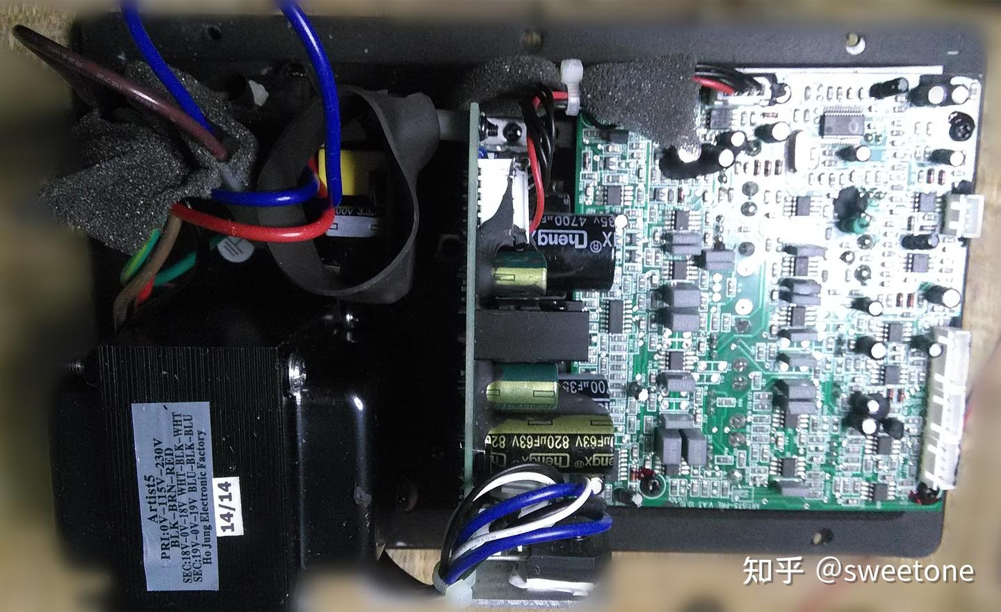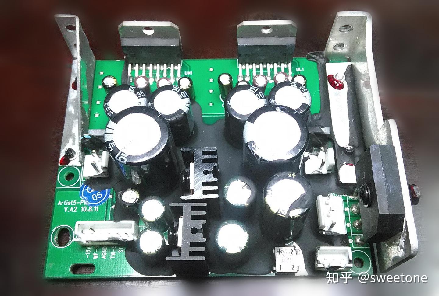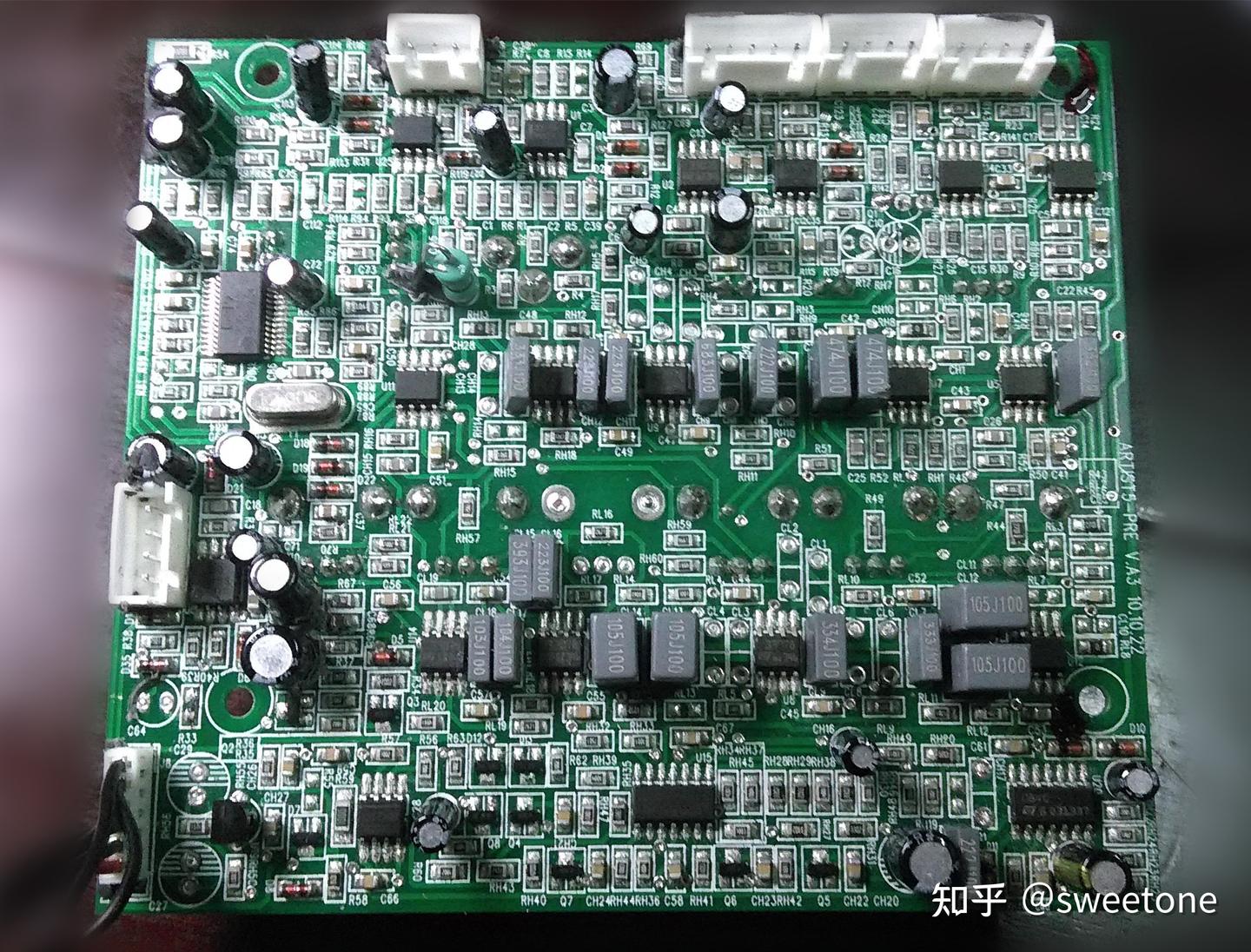 本音箱的内部布局及各个电路板如图3 ,图4,图5,图6 所示。信号流程如图7所示(电路只含其中一只音箱,另一只音箱电路用料相同)。本音箱的音频信号通路中,运放用的比一般有源音箱多,而且没有使用常见的4558运放,用的是高速运放33178(U1,U3,U25)、高速运放33078(U2,U3,U4,U5,U7,U8,U9,U10,U11,U12,U13,U14)和TL082(U16)。高音压限电路用于控制的运放也用TL084(U15,U20)。而高低音扬声器是各用一片TDA7294功放电路(UH1,UL1)来推动。该音箱标称RMS功率是高低音各50W,可见功放芯片有余量。从每个音箱中变压器的大小看,功率在100w左右。电路板上的电阻电容用的是贴片元件。大的电解电容也使用的是普通规格。可见,厂家对有源器件比无源器件重视,并没有使用发烧电阻电容。