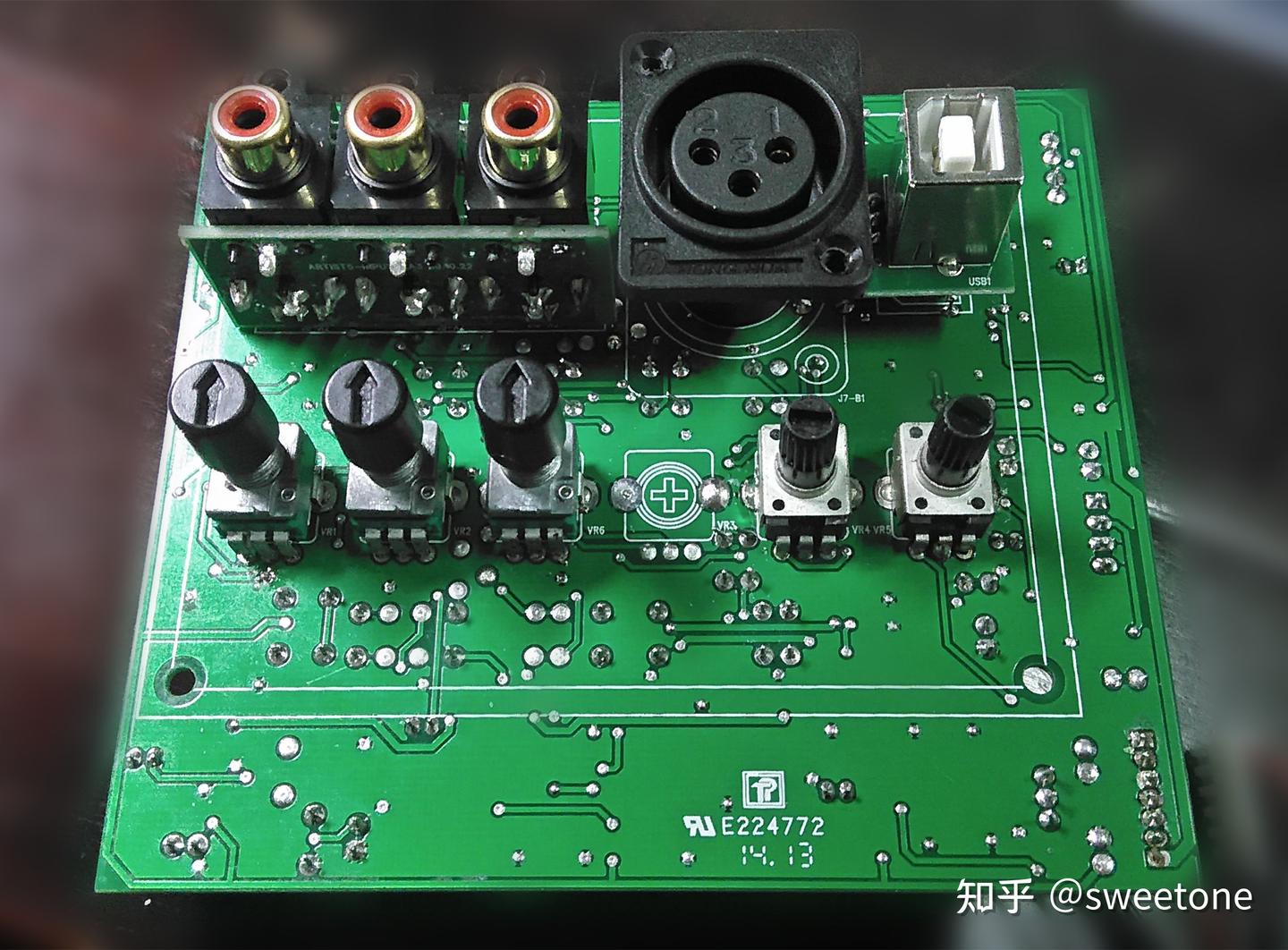 该音箱前面板有3.5mm立体声输入端口,左声道信号输入到运放U25(2/2)缓冲。音箱后面板有非平衡RCA输入端口,单声道信号输入到运放U1(2/2)缓冲。音箱后面板有平衡XLR 输入端口,单声道平衡信号输入到运放U1(1/2)转为非平衡信号。USB L左声道信号也在此和上述三路信号输入。信号再经过U2(1/2)缓冲后,在U29(1/2)和前面板音量电位器组成的反馈式音量放大电路调整音量(其实是改变U29(1/2)的放大倍数),再经过U5(2/2)和后面板高音音调电位器VR1组成的反馈式音调电路调整高音音调(>5KHZ)。再经过U5(1/2)和U7(1/2)和后面板低音音调电位器VR2组成的反馈式音调电路调整低音音调(<300HZ)。电路中音量和音调调整都采用反馈式电路,使得音量小或音调调低时,电路增益较低。相对于衰减式音量控制电路,此举能提高电路在小音量时的信噪比。一般高低音调调整电路使用一个运放,而此电路中高低音调调整电路使用U5(2/2) 、U7(1/2) 和U5(1/2)三个运放,减轻了高低音电位器调整时的相互影响,降低了失真。另外,本音箱属于偏向于监听级设计,所以高低音调的调整范围只有+---6dB,没有一般功放+---10dB的调整幅度大。
