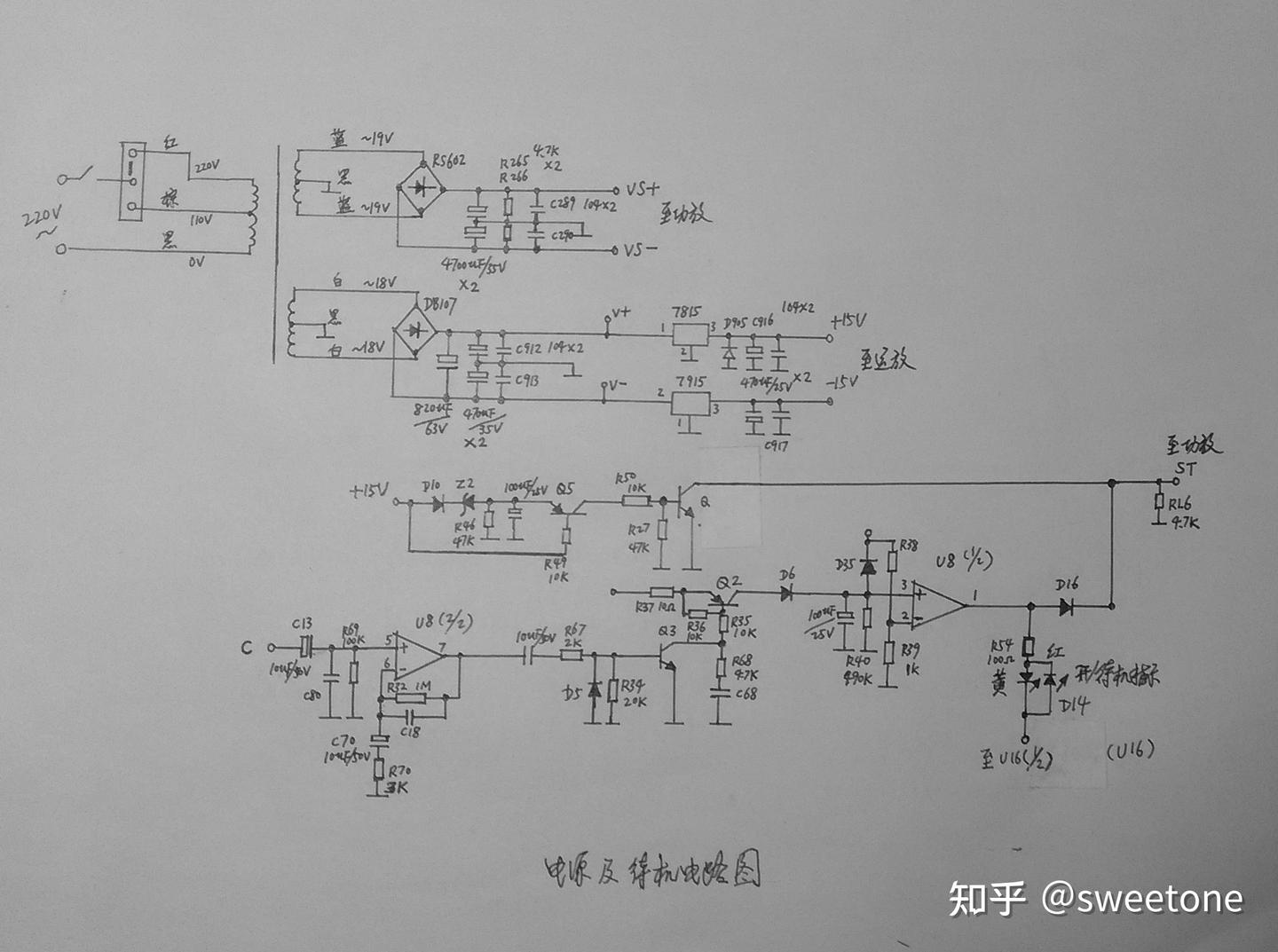 待机控制 :有信号输入音箱时,左右声道信号混合后的信号C(见前级音调部分图),经过运放U8(2/2)放大后,经过D5检波后控制Q3和Q2饱和导通,此时U8(1/2)输出正电压,一是给功放的ST(待机)信号提供高电平,功放可以正常工作;另外,U8(1/2)驱动工作指示灯D14发黄光。无信号输入音箱时,运放U8(2/2)无信号控制Q3和Q2饱和导通,此时U8(1/2)输出负电压,给功放的ST(待机)信号为低电平,功放不工作;另外,U8(1/2) 驱动工作指示灯D14发红光。