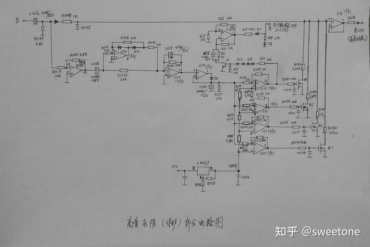压缩限幅电路分四个梯次。LM317设定的电压提供给压缩限幅电路作为基准电压值。第一档由U15(4/4)及Q4等组成,此档基准电压是:V1= VREF×RH32/(RH32+RH33+RH34+RH35),当平均值中的峰值信号大于此档基准电压的话,U15(4/4)驱动Q4饱和导通,,RH43下拉到地,输入U16(2/2)的高音信号电压就是U=UB×RH43/(RH43+RH48)。第二档由U15(3/4)及Q5等组成,此档基准电压是:V2= VREF×(RH32+RH33)/(RH32+RH33+RH34+RH35),当平均值中的峰值信号大于此档基准电压的话,U15(3/4)驱动Q5饱和导通,,RH42也下拉到地,输入U16(2/2)的高音信号电压就是U=UB×(RH43与RH42的并联值)/ (RH43与RH42的并联值+RH48)。以此类推,当平均值中的峰值信号大于第三档U15(2/4)的基准电压的话,输入U16(2/2)的高音信号电压就是U=UB×(RH43与RH42及RH41的并联值)/ (RH43与RH42及RH41的并联值+RH48)。当平均值中的峰值信号大于第四档U15(1/4)的基准电压的话,输入U16(2/2)的高音信号电压就是U=UB×(RH43与RH42、 RH41及RH40的并联值)/ (RH43与RH42、 RH41及RH40的并联值+RH48)。由此可见,高音信号B的平均值的峰值幅度越大,输入到U16(2/2)的高音信号被压缩限幅的越厉害,这样就在一定范围里保护高音扬声器安全工作。而此压缩限幅的程度也是随着高音信号幅度连续线性变化的。(电路如图11所示)
