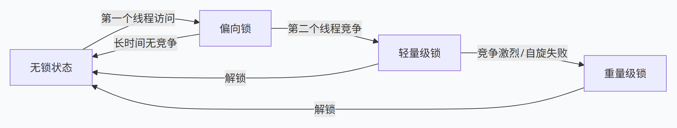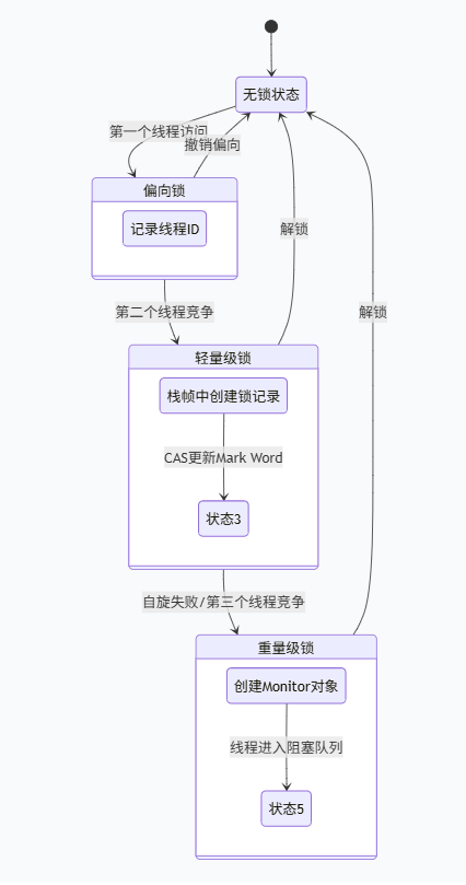 | 无锁 | 哈希码、分代年龄等 | 默认状态,无同步开销 |