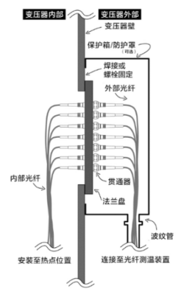 变压器绕组光纤测温系统由:变压器绕组光纤测温装置、内部光纤传感探头、外部光纤传感探头、贯通器与法兰组件构成。