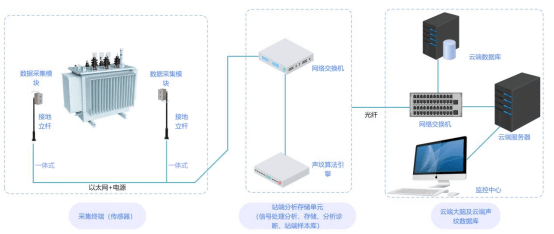 **声纹在线监测:**变压器声纹监测系统是一种非侵入式智能诊断技术。它通过采集变压器运行时的声音信号,利用人工智能算法进行分析处理,就像给变压器做"声学指纹"识别。该系统能实时辨识内部松动、放电、磁致伸缩等早期机械与电气故障,实现故障预警和状态评估。