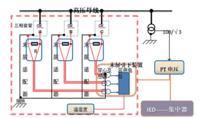 变压器套管在线监测装置,实现对主变的高压侧三相套管和低压三相套管的绝缘状态在线监测。装置由末屏适配器、未屏电流引下线、零磁通互感器 CT、电流监测电路、PT电压监测模块、IED主机组成。在末屏接口上安装有接地保护功能的末屏适配器,在主变下方安装末屏引下装置箱,箱体内汇集三相套管的末屏电流信号,同时箱体内装有穿心测量方式的零磁通电流互感器和电流监测电路,实现未屏电流的数据采集。