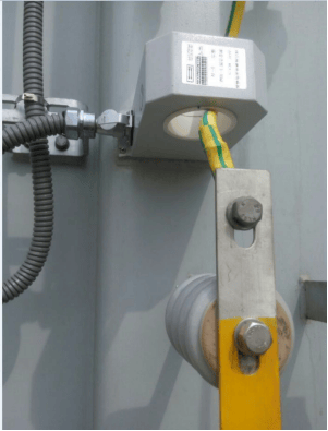 3、高频电流局放传感器(如图2)安装:传感器套结在变压器接地铜排上。