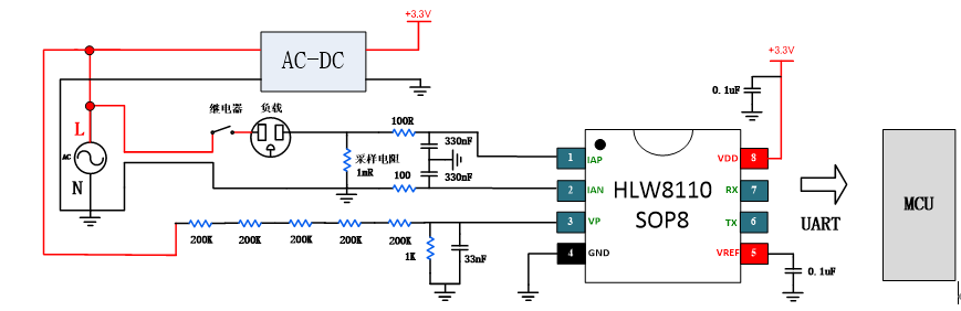 下图是HLW8110的典型电路,外围电路简单,外围器件非常少,单路通道可用于检测负载设备的功率、电压、电流和用电量,通过UART或接口传输数据至MCU,HLW8110内部可以设置功率过载、电压过载和电流过载等参数。